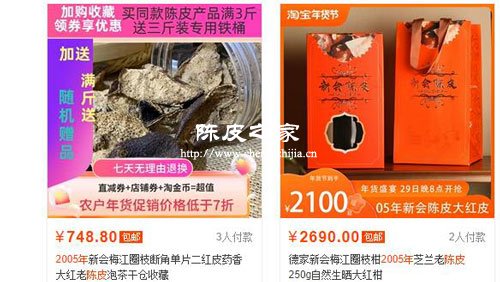 05年的陳皮多少錢呢,我們可以在網店中搜索一下“2005年陳皮”,可以看到標注有2005年的陳皮,價格相差巨大,高的兩千多元,而便宜的則只要幾百塊錢。當然,可能是分量不同導致的。