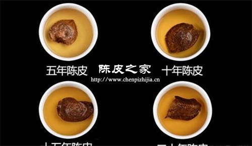 一般三年左右的陳皮的茶湯顏色比較金黃色,陳皮煮水味道也會微酸。超過三年的、五年以上的陳皮茶色屬于黃紅色,喝起來酸苦味淡去了,有點清香味。二十年以上的陳皮煮水顏色可能會偏黃褐色的多。