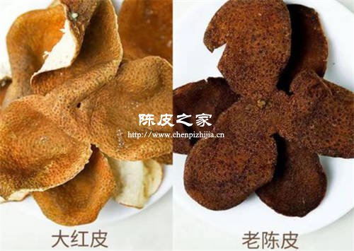 新會陳皮:年份比較短的新會陳皮,外表面呈鮮紅色或暗紅色,內表面則是雪白色或微黃色;而年份比較長的新會陳皮的橘白部分會風化脫落,呈棕褐色或黑色。
