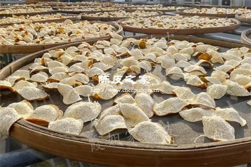 1、天然生曬:放在陽光下自然曬干的方法,優點是對陳皮營養物質的損失最小,口感好,價值比較高;但缺點也很明顯,就是陳化速度慢,晾曬過程中容易發霉、返潮,生蟲等,所以產量也比較低,價格高。