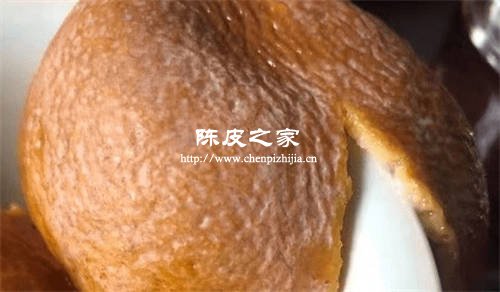 首先我們看正常的陳皮狀態:外皮很干很硬,且是黃褐色,或者很重的褐色,內瓤白色發黃,或者是微黃色。油包通過陽光或者燈光照射會很明顯均勻,大小一致。