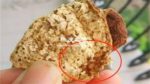 蟲子一般會啃食掉陳皮的內囊結構,使內囊外觀斑駁,陳皮出現較多、手感細膩的蛀粉,蟲子本會攜帶很多的細菌和病毒,因此被蟲咬過的陳皮會受到污染,不可以泡水喝。