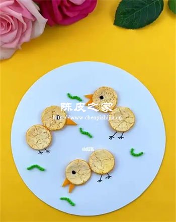 (4)孩子們可以兩個橘子皮組合不同形態(tài)的小雞,再進行添畫,毛毛蟲可以用彩泥或添畫的方式完成。