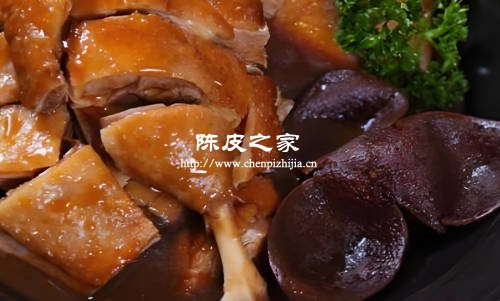 將凈雞切成小塊,用蔥、姜、料酒等腌漬入味。陳皮切小塊,熱油中放入花椒、陳皮稍炸,再放入雞塊,加少量水,中火收湯,最后淋上香油。雞肉補虛損,陳皮燥濕化痰、去腥提鮮,二者結合健脾益氣。