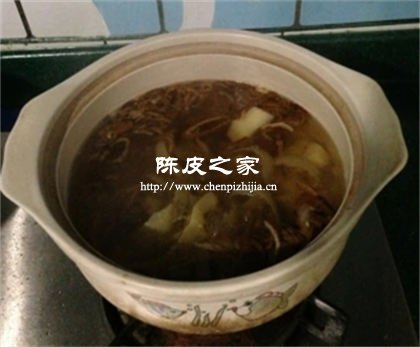 3.在砂鍋中加入適量的水,大火燒開。放入陳皮、梨皮和果核,燒開后撇去浮沫,小火煮20分鐘。